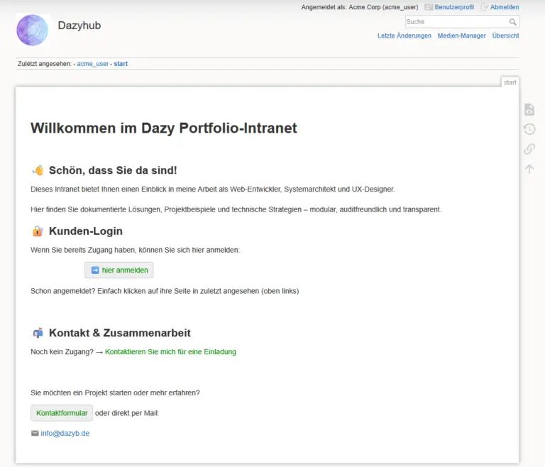 - Modularer Aufbau mit DokuWiki: leichtgewichtig, update-sicher, ohne Datenbank